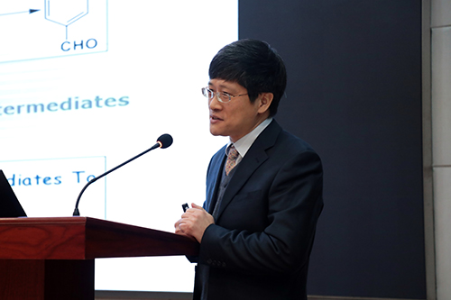 俞飚主持了学术报告。Dolbier教授、上海有机所肖吉昌研究员和江西隆莱生物制药有限公司董事长吴生文博士分别作了题为:“New Development of Difluorocarbene Chemistry”、“Phosphonium-based Fluorine-containing Reagents and Reactions”和“‘研发到创业’之路”的精彩报告。俞飚强调我们要以陈庆云先生为榜样,传承有机所的优良传统,继承有机所的优良学风,并表达了对陈先生90华诞的诚挚祝福。