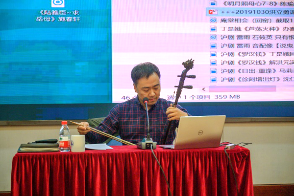 之后的观众互动环节中,同学们积极的进行互动, 提出了“存在语言障碍应该如何欣赏沪剧”、“沪剧与越剧有哪些异同”、“可以通过哪些渠道获悉沪剧演出信息”等问题,洪立勇老师一一进行了耐心细致的解答。最后,洪老师应台下同学邀请,现场演奏了悠扬婉转的《紫竹调》,将全场气氛推上了高潮。