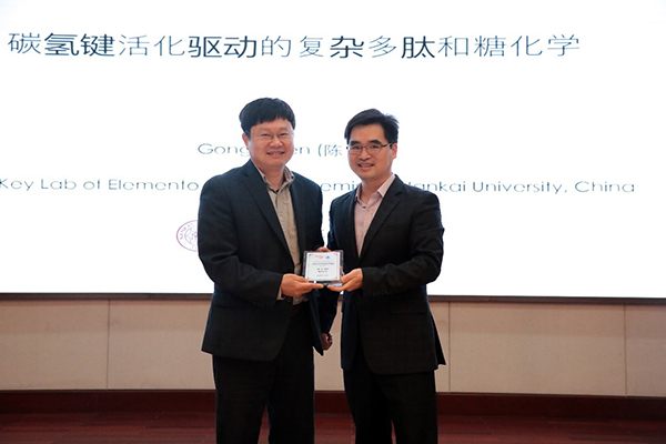 11月9日上午,南开大学陈弓教授应邀来上海有机所作了题为“碳氢键活化驱动的复杂多肽和糖化学”的学术报告。报告在君谋楼一楼报告厅举行,由中科院天然产物有机合成重点实验室的洪然研究员主持。
