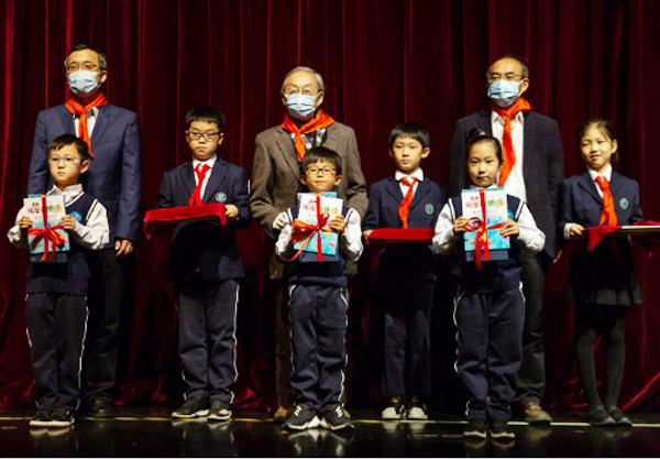 胡金波书记(左)、戴立信院士(中)、唐勇院士(右)为建襄小学小朋友赠书