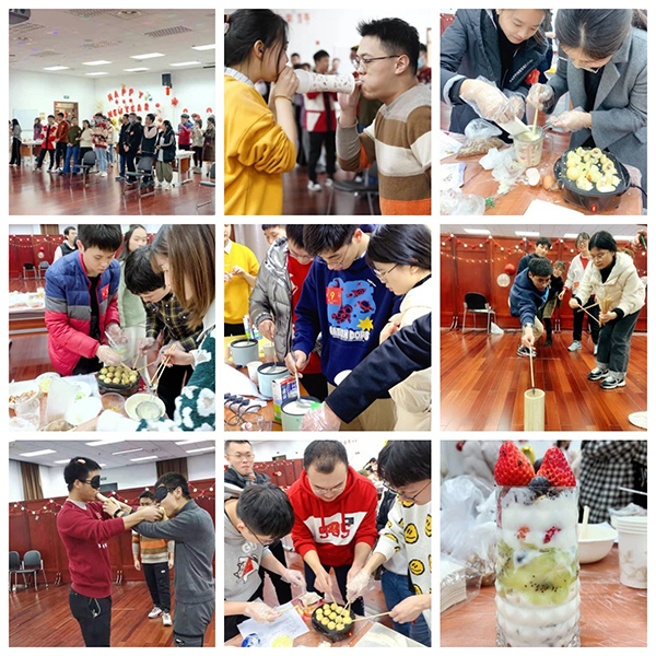 晚会在小游戏——“气球传纸杯”中拉开帷幕,这个饶有趣味又非常强调团队配合的游戏瞬间就点燃了全场热烈的气氛。随后美食制作也如火如荼地展开,现场50人被分为10组,每组成员都合理分工、有条不紊地制作了奶油泡芙、章鱼小丸子、焦糖奶茶和酸奶水果杯等食物。实验练就的巧手此时也自然游刃有余,尤其是对酸奶水果杯的制作,大家各显神通、充分发挥艺术细胞和聪明才智,把它摆放成了一道道精致的艺术品。在热火朝天的制作空档,大家也没有闲着,研会预先策划了两个串场小游戏——“盲人吃香蕉”和“趣味投壶”,新颖又颇有难度的游戏一次次成为现场的欢乐的源泉。