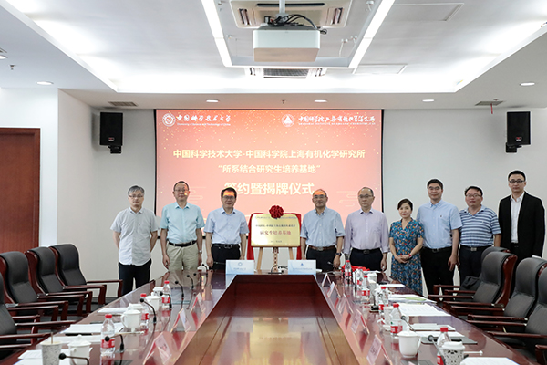 为促进科教融合工作全面开展,深化所系结合工作机制,6月24日,“中国科大-中科院上海有机所共建所系结合研究生培养基地” 签约暨揭牌仪式在上海有机所举行。上海有机所所长唐勇、副所长刘文、学位委员会副主任黄晓宇、学位委员会副主任张新刚、研究生部主任王娟;中国科大研究生院常务副院长龚流柱、化学与材料科学学院执行院长刘世勇、副院长邓兆祥出席了揭牌仪式。仪式由刘文主持。