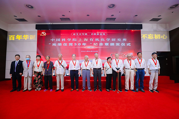 在“光荣在党50年”纪念章颁发仪式上,游书力为戴立信等党龄达到50周年的12位老党员代表颁发纪念章,体现了以习近平同志为核心的党中央的关怀和温暖,也充分肯定了各位老党员为社会主义事业、有机所发展做出的重大贡献。