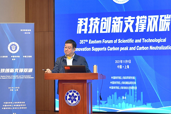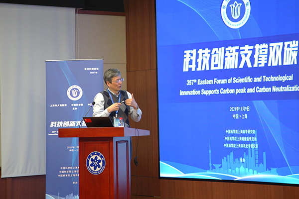 11月9日,第357期东方科技论坛“科技创新支撑双碳”研讨会在中国科学院上海分院举办。本次论坛由上海市人民政府、中国科学院和中国工程院主办,中科院上海有机化学研究所、中科院上海高等研究院、中科院上海硅酸盐研究所联合承办。中科院上海有机化学研究所唐勇院士、中科院上海硅酸盐研究所施剑林院士、中科院上海高等研究院魏伟研究员共同担任会议执行主席。中国工程院院士黄震、中国科学院院士赵东元、中科院上海高等研究院副院长邰仁忠、中科院上海硅酸盐研究所副所长吴成铁以及来自科研院所、高校的90余位嘉宾和专家参加了论坛。