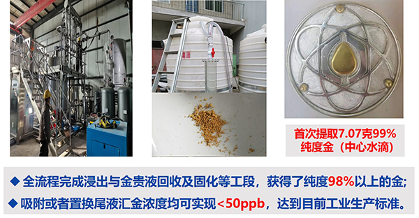 无氰提金药剂开发实现氰化物零排放。全球黄金冶炼85%以上采用氰化法,氰化钠作为毒药之王,生产、运输、存储、使用及废弃物对环境和人体健康造成极大威胁。团队开发出了绿色无毒、价格低廉的提金药剂和浸取体系并实现了吨级示范应用。无氰提金开创了黄金清洁生产新途径,有望实现黄金冶炼“脱毒向绿”。
