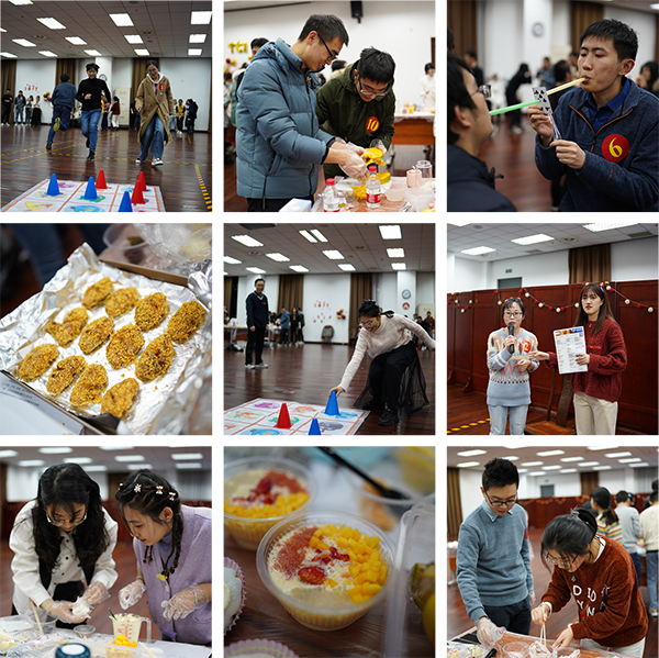 线下活动同样精彩纷呈,12月25日晚,“元旦嘉年华”活动在君谋楼多功能厅举行,大家欢聚一堂,喜迎新春。每组成员都合理分工、井然有序地制作了烤鸡翅、水果沙拉、雪媚娘和杨枝甘露等食物。烤鸡翅香气四溢,水果沙拉秀色可餐,雪梅娘憨态可掬,杨枝甘露甜甜蜜蜜,一道道美食经过大家的巧手加工,格外诱人。在制作空档,大家开心地参与了两个串场小游戏,“井字棋”和“吸管传纸牌”,看似简单实则颇有难度的游戏让大家沉浸其中,现场气氛热烈,高潮迭起,成为一片欢乐的海洋。