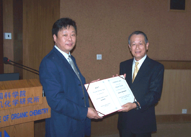 Masaaki Yamabe先生在化学界,特别是在氟化学领域地位突出、成就斐然,为促进有机所氟化学领域研究工作的快速发展及突破,上海有机所特聘Yamabe先生为“中国科学院上海有机化学研究所客座教授”。Yamebe先生就其历年来的学术积累为有机所研究人员作了题为“Fluorine Chemistry—Past, Present and Future”的学术报告,详尽介绍了氟化学领域的研究进展,特别是环境友好氟化学的发展态势。