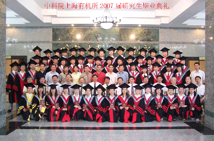 2007届毕业生共有50名博士、5名硕士。研究生部主任高晓兰宣读了2007届毕业生学位授予名单。在轻快的进行曲中,毕业生们满怀喜悦之情,依次从姜标所长、张建新书记、丁奎岭副书记和戴立信院士的手中接受颁发的毕业证书。