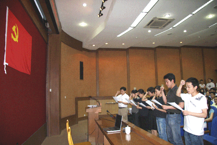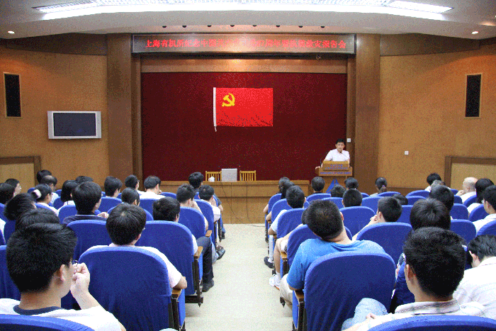 会议在中华人民共和国国歌声中开始,首先举行了新党员入党宣誓仪式,在丁奎岭书记的领誓下,面对党旗,宣读了为共产主义奋斗终身的神圣誓言;之后上海微系统所赴四川汶川地震灾区科技救援队的琚诚同志报告了救援队在灾区的感人事迹。