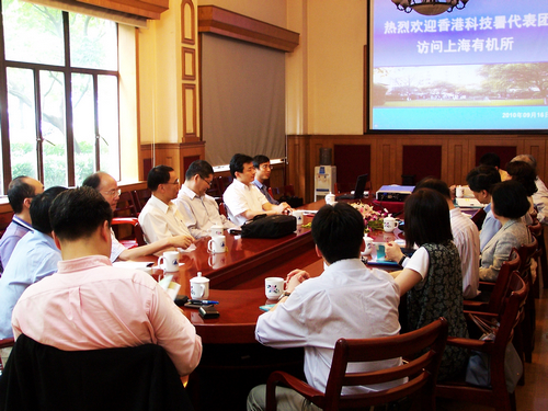 2010年9月16日下午,由香港创新科技署署长王荣珍女士带队的代表团一行十一人访问了上海有机所,随团访问的还有香港浸会大学校长陈新滋院士、香港理工大学应用科学及纺织学院院长黄国贤教授、创新科技署科学顾问余安正教授、香港应用科技研究院有限公司首席科技总监任德盛教授、香港大学技术转移处副处长余梓山先生、香港科技大学技术转移中心发展经理李远先生等。有机所丁奎岭所长、马大为副所长、侯雪龙研究员、刘文研究员和游书力研究员参加了接待活动。