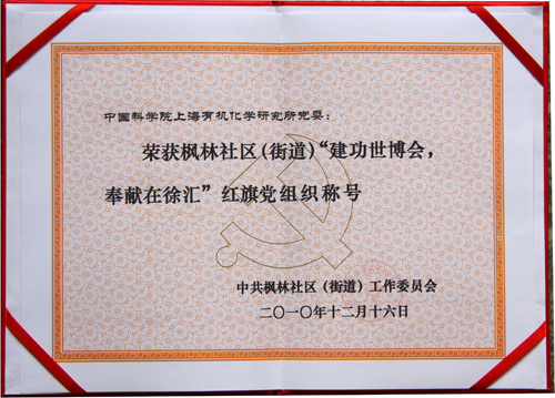 近日,在徐汇区枫林街道召开的世博工作总结大会上,中科院上海有机所党委被评为“建功世博会,奉献在徐汇”红旗党组织称号。