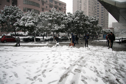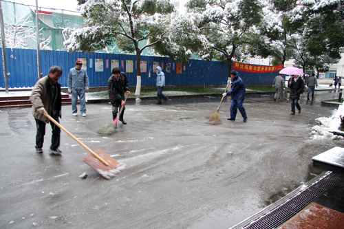 1月20日,上海漫天飞雪,一片银装素裹。雪花给大家带来欣喜和快乐的同时,也给人们带来了交通出行的不便。连夜的风雪导致路面积雪湿滑,稍有不慎,极易摔倒,造成各种事故。为了及时排除险情,保证道路顺畅,当天一大早,综合服务管理处的领导组织了20余名员工进行扫雪。大家顶着风雪,不畏严寒,挥舞着铁锹、扫帚清除院子内的积雪。全体人员充分发挥了团结协作、奋力拼搏的精神,大家一锹一锹地铲除掉了道路上厚厚的积雪。虽然天气寒冷,但整个劳动现场热火朝天,经过近一个多小时的清扫,终于把道路的积雪清扫的干干净净,保证了大家的安全出行。