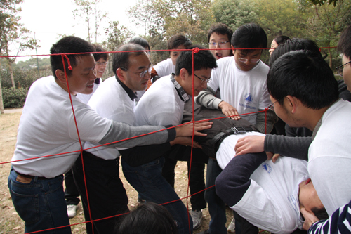 在这次拓展训练中,全体成员被随机编为6支小分队,队长、队旗、队歌的设计迅速将队员们的热情和积极性调动起来,使每个人立刻感受到了个人的责任和团队的凝聚力。在模拟战争时期的“穿越电网”项目中,队员们经历了从犹豫到积极讨论策略到坚定信念的过程。面对考验,队员们团结协作,坚守“不抛弃,不放弃”的信念,最终每个团队都经受住了考验。当所有队员都穿过电网的那一刻,大家振臂高呼,欢庆胜利!“鼓动人心”、 “领导者脚步”、“挑战5分钟”,一个个团队合作项目的顺利进行,使成员之间的关系越来越融洽,配合也越来越默契。