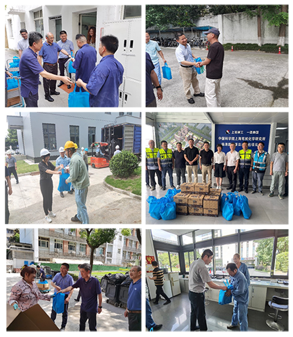 近期上海持续高温,2023年7月21日-27日,上海有机所所长唐勇、党委副书记(主持工作)游书力、副所长刘菲、纪委书记石岩森、工会主席张新刚分别带队走访了枫林园区玻璃维修车间、公共技术服务中心、在建工地、高压釜房、仓库、后勤和安全部门、临港园区在建工地、金山中试生产基地,为坚守在高温工作岗位的职工送去了清凉慰问品。