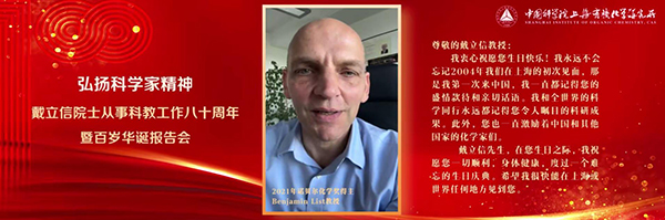 2021年诺贝尔化学奖得主Benjamin List教授和著名化学家Eiichi Nakamura教授以视频形式回忆与戴立信院士的初次相识和在学术交流过程中建立的深厚友谊,并向戴立信院士表达衷心的祝福。