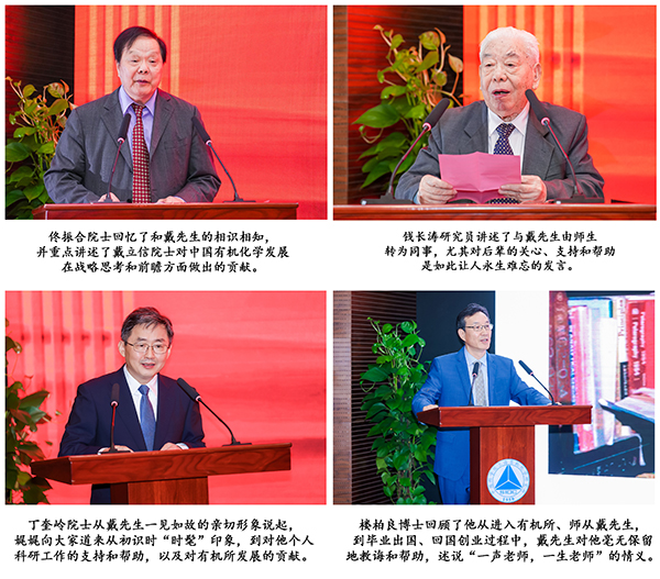 佟振合院士、钱长涛研究员、丁奎岭院士和康龙化成新药技术有限公司董事长楼柏良博士依次作为同行、同事和学生代表发言,从不同侧面展现了戴立信院士为学、为事、为人的“大先生”风范。