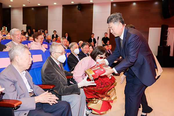 副所长刘菲代表研究所向戴立信院士献花,纪委书记石岩森代表研究所向戴立信院士赠送志庆集。