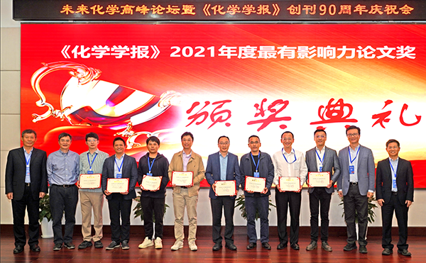 会议还举行了“《化学学报》2021年度最有影响力论文奖”颁奖典礼。史炳锋、顾庆、俞寿云等作者的11篇文章分别获奖。俞飚、王利祥、陈鹏、游书力老师向获奖作者颁奖并合影留念。“《化学学报》年度最有影响力论文奖”主要奖励《化学学报》某年度及其前两年内发表的,在该年度被引用次数较多的论文。奖励通信作者荣誉证书,第一作者奖金和荣誉证书。
