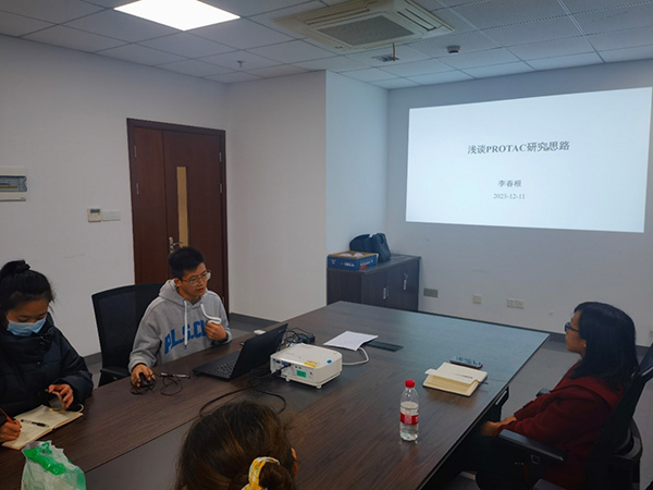 本次邀请来自丁克研究员团队的两位同志进行了学术分享。首先李春根同志进行了《浅谈PROTAC研究思路》的报告分享。李春根同志主要介绍了PROTAC技术的概念、发展和应用,以及通过介绍靶向PIKfyve的PROTAC降解剂的设计、改造和评价,讲述了从药物设计的角度如何逐步实现对小分子活性和药代性质的迭代优化。
