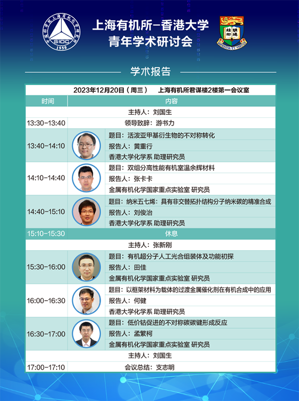 上海有机所沪港化学合成联合实验室主任刘国生研究员和先进氟氮材料重点实验室副主任张新刚研究员主持报告。双方6位青年科研人员在不对称催化、高性能发光材料、拓扑结构分子纳米碳、超分子化学等领域的最新研究结果做了学术汇报与交流。