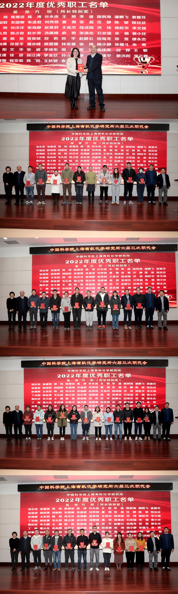会上还举行了优秀职工颁奖仪式,人力资源处副处长(主持工作)蒋咏文宣读了获表彰名单。唐勇所长、游书力副书记(主持工作)、刘菲副所长、张新刚主席共同为全体获表彰职工颁发了荣誉证书。