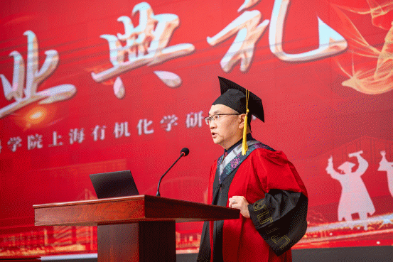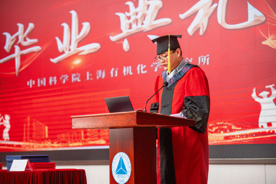 唐勇所长代表上海有机所向所有毕业的同学们致以热烈的祝贺,向所有为学子辛劳付出的老师们,向所有陪伴和支持学子成长的亲友们,致以诚挚的敬意和衷心的感谢!他满怀欣慰与骄傲地说:“从一纸录取通知书到一份毕业证,这段旅程中,你们突破自我,勇毅前行,在不断地尝试和探索中,逐步明晰前进的方向。你们与时代同频,赓续薪火,在党的二十大吹响新征程的号角声中,立下‘强国有我’的誓言,回应时代的呼唤。你们这无数或苦涩或喜悦或热血的瞬间,镌刻在零陵路345号的光影里,展现了你们勇攀科学高峰的强大生命力。”