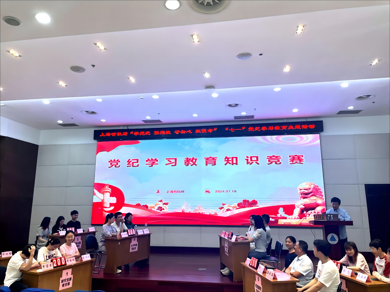 为庆祝中国共产党成立103周年,深入学习贯彻习近平总书记关于党纪学习教育的重要讲话和指示精神,进一步丰富党纪学习教育内容,促使广大党员、干部职工养成“学纪、知纪、明纪、守纪”的思想自觉,进一步提高全所广大党员的纪律规矩意识和履职担当意识,推动党纪学习教育走深走实,为抢占科技制高点提供坚强纪律保障。7月18日上午,所纪委、监督审计处、工会联合举办党纪学习教育知识竞赛,上海有机所所长唐勇、副所长刘菲,纪委书记石岩森出席活动。