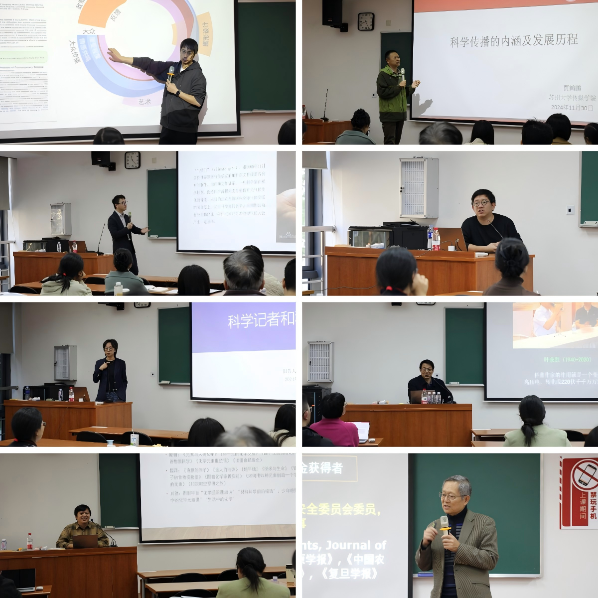 在主题报告环节,苏州大学的贾鹤鹏教授和杨正副教授,分别对科学传播的内涵及发展历程、科学传播的模式进行报告;中国科学院大学科协常务副秘书长吴宝俊以国科大春分工程为例,分析了中国科学院高端资源科普化过程中的思考与一些实践;资深媒体人卢雁从科学记者的角度,剖析了科技在新闻报道中的传播;科普时报社社长尹传红从科普创作的视角,围绕创意、表达与思考等三个层次指导大家如何写好科普文章;科学松鼠会的孙亚飞从化学元素的角度,阐述了如何开展化学知识传播工作;复旦大学卢宝荣教授从艺术的角度,讲述了如何助力科学传播;以及中国科学技术大学艺术与科学研究中心梁琰副教授以《美丽化学》项目为切入点,展示了如何发现科学之美,如何借助视频呈现科学之美。