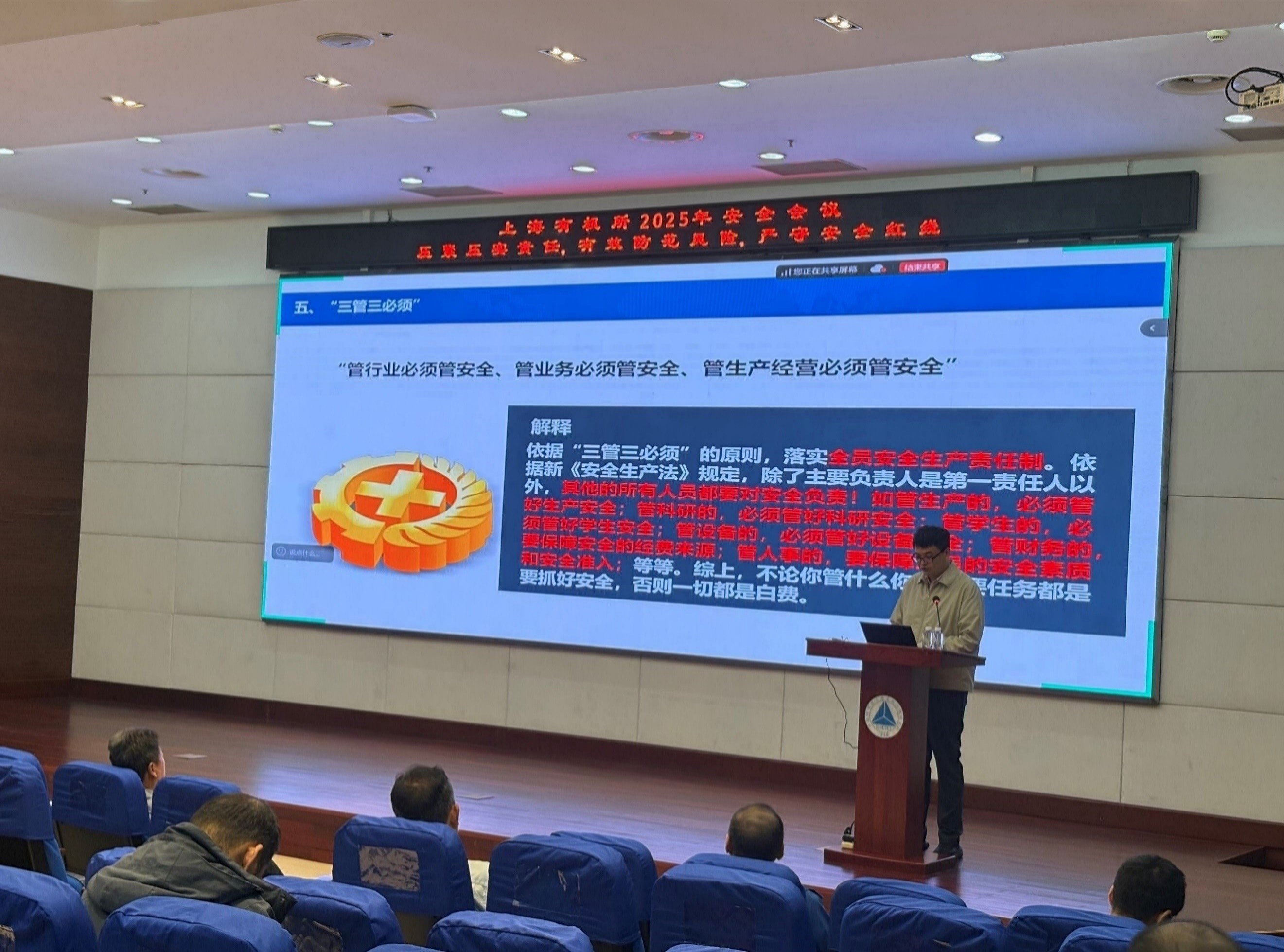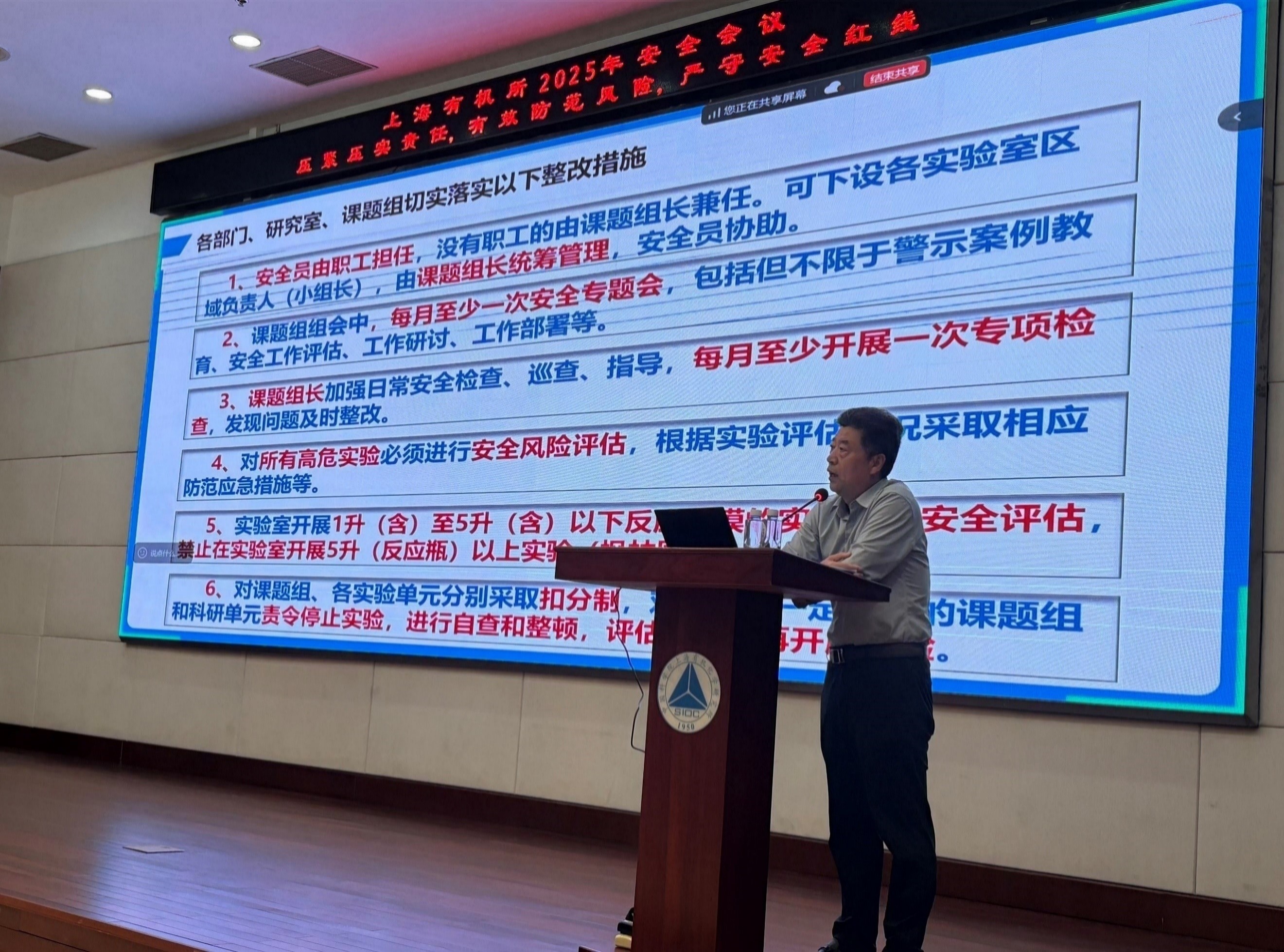 5月19日上海有机所召开2025年度安全工作会议,所领导班子成员、研究室及部门负责人、课题组长、安全员、各级工作人员等及金山基地、交叉中心、宁波基地分会场近300人参加会议。