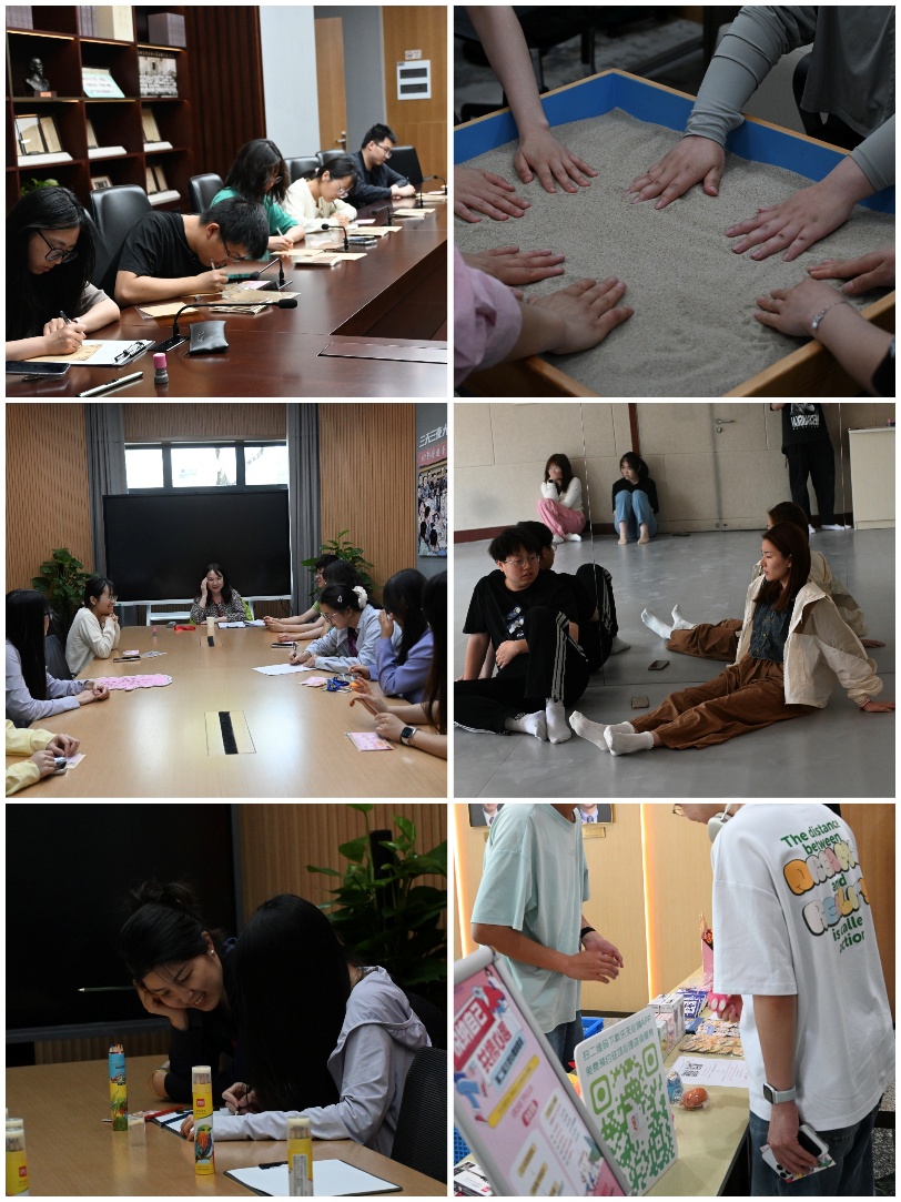 本次心理游园会共策划组织了六大主题的心理体验游戏,大家在专业指导老师的带领下,从各类游戏中体验到倾听自己、自助互助、身心合一的乐趣。“给未来的自己”给大家提供了一个给未来的自己写信的机会,装入亲手制作的火漆信封中,将自我期待带向远方;“艺术疗愈之旅”带领大家通过颜色和图形进入到潜意识世界,回归内心,专注当下;“恋爱时光机”通过情境带入、案例分析和辩论探讨,鼓励同学们从不同的维度观察自己的恋爱价值观以及对亲密关系的认知;“遇见OH卡遇见你”通过OH卡引导大家探索对自我的认知,培养创造力与感知力;“沙盘游戏坊”通过潜意识投射,看到内心的冲突与矛盾,在深度思考的同时让积累已久的压力得到释放;“正念减压之旅”倡导“活在当下,放下执着”的心态,摆脱压力的裹挟,寻求内心的平静。