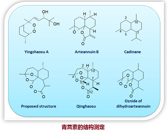 1973年分得了青蒿素单体后开展的药理和临床研究证明,它对疟原虫尤其是对抗性虫株有极高的杀灭作用,但是它的化学结构却在二年多以后才最后得到完全的确证。1975年初,根据当时能测得的波谱数据,综合化学反应研究结果后,已经能得出结构的大致状况,如青蒿素是一分子式为C15H22O5的倍半萜内酯化合物,不含羟基和双键。以后在另一抗疟天然产物鹰爪甲素(yingzhaosu A)是过氧化合物这一信息启发下,通过定性和定量分析,证明青蒿素也是一个过氧化合物。再参考南斯拉夫从同一植物中分到的属倍半萜杜松烷(cadinane)类型的青蒿乙素(arteannuin B)结构,提出了过氧基团处于内酯位的可能结构,为当时生物物理所的计算提供了有益的参考。当然完整的、确切的青蒿素结构最后还是由生物物理所在化学推断的基础上1975年底通过单晶X-衍射分析才定了下来,1978年再由反常散射的X-衍射分析最后确定了青蒿素的绝对构型。
