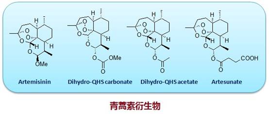 如果从印第安人的传统药物金鸡纳树皮中分离得到的奎宁称为疟疾治疗史上的第一座里程碑,那么从中国传统药物青蒿中得到的青蒿素就是第二座里程碑。上世纪70年代青蒿素发现之后,对它的体内外抗疟活性和临床试验作了全面的研究。青蒿素对疟原虫敏感株和抗药株有很高的杀灭活性,半数抑制所需的浓度(IC50)仅为1~10 nM;对鼠疟(P. berghei)抗氯喹虫株,90%抑制剂量(SD90)为 6 mg/kg,杀灭疟原虫的速度快于氯喹;在临床试验中,病人平均退烧时间和疟原虫平均清除的时间均小于48 小时,而且对于抗药性恶性疟病人也显示良好的疗效。青蒿素在体内吸收快、分布广、代谢快,能够透过血脑屏障,特别适用于抢救脑型疟和凶险型疟疾,但是青蒿素的水溶性和脂溶性均差,只能制成口服制剂,难用于抢救危重病人,另外青蒿素的代谢快,生物利用度较小,造成近期复发率较高(约 50 %)。为此,开展了将青蒿素作为先导化合物,制备青蒿素的衍生物等的结构改造工作,以探索更佳的抗疟药物。在制备和筛选了一批二氢青蒿素的醚、羧酸酯和碳酸酯的衍生物后,发现这些衍生物大多具有比青蒿素更高的活性,其中蒿甲醚(artemether)、青蒿琥酯(artesunate) 的抗疟活性均高于青蒿素几倍且易于制成油针剂或水针剂,1987年它们被批准生产,1992年二氢青蒿素和蒿甲醚-本芴醇复方批准生产,以后又有几个二氢青蒿素的复方批准生产。由于青蒿素类抗疟药在国外临床上同样显示高效、速效和低毒的优点,逐渐在世界范围内使用,世界卫生组织(WHO)先后将蒿甲醚、青蒿琥酯和蒿甲醚--本芴醇复方收入基本药物目录。青蒿素本身则已退出临床,而仅作为青蒿素类药物的原料。