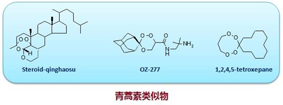 青蒿素结构发表后即引起世界卫生组织和全球药学界的关注,在重复确证了中国科学家的结果后,植物化学界在全球开展了青蒿素资源的寻找,药物化学界也从还原青蒿素出发探索合成新的青蒿素衍生物,包括近年合成的Artemisone,但从性价比等因素考虑,都难于取代已有的蒿甲醚和青蒿琥酯。美国Walter Reed军事研究院等由美国的需要出发,另行开发、上市了蒿乙醚(arteether),但并无特别的优越性。国际药物化学界的另一个动向是基于青蒿素含有的过氧结构,过氧基团是青蒿素类药物的关键活性基团,也是截然不同于第一代奎宁类抗疟药的特别之处,为此一些实验室开展了过氧化合物的设计、合成和抗疟作用的研究,迄今合成了一批青蒿素类似物,它们或继续保留青蒿素的1,2,4-三噁烷的基本骨架,或含有不同环内过氧基团的结构单元,前者如嵌入胆固醇的甾体-青蒿素(steroid-qinghaosu),后者如OZ-277 (RBx11160)和1,2,4,5-四氧杂环辛烷类化合物(1,2,4,5-tetroxepane),它们的抗疟活性与青蒿素相仿,或更高,虽然目前还只处于实验室阶段,但这也显示抗疟药的研发已进入了青蒿素类的新时期。