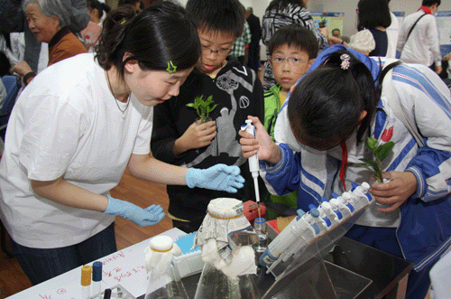科普专题讲座结束后,来访者在志愿者的引导下分批分别参观了金属有机化学国家重点实验室、生命有机化学国家重点实验室、中国科学院天然产物有机化学重点实验室、中国科学院有机氟化学重点实验室和上海有机所高分子材料研究室集中展示厅。各展厅通过视频、幻灯片、展板、趣味化学实验等多种形式向公众展示了各研究室所涉及的领域及化学与人类生活之间千丝万缕的联系。由各研究室研究员、职工和研究生组成的志愿者们通过耐心讲解和示范,生动地揭示了化学世界的奥妙,来访者兴趣盎然、热情高涨,化学反应过程中产生的颜色和物质形态的变化唤起了大家强烈的兴趣和好奇心。许多同学迫切地想要走进奇妙的化学世界,兴致勃勃地自己动手操作起小实验,体会其中的乐趣所在。