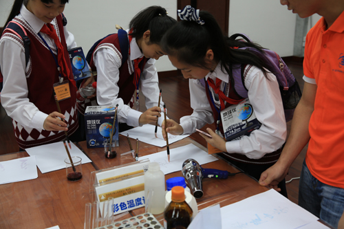 另外,金属室的研究生志愿者们为来访的参观者精心准备了十一个非常有趣的化学小实验:水质监测、浴水重生、酸碱心里美、胶水制弹球、水中花园、生活中的维生素C、谁灭了蜡烛、颜色秋千、彩色温度计、隐形墨水、可乐变雪碧。实验中化学反应产生的颜色和物质形态的变化等引起了参观者强烈的好奇心,他们兴趣盎然、热情高涨,在志愿者的帮助下积极动手参与,并提出了感兴趣的问题,得到了志愿者们耐性细致地回答,同时在志愿者的专业指导下,他们还很认真地亲自操作,一个个有趣的实验让参观者们充分领略到了化学的神奇与美好。在水质监测的科普小实验中,他们学会了用简单的方法初步监测饮用水所含物质;在浴水重生的过程中,他们领会了颜色分离的奥秘;在体会酸碱心里美的同时,他们发现了酸碱的奇妙;在胶水制弹球时,他们创造了许多美妙有趣的作品;在“游览”水中花园时,他们亲眼目睹了科学的神奇;在生活中的维生素C的实验台前,他们探索了维生素C的奥秘;在体验颜色秋千的过程中,他们享受到了化学实验的创造性和乐趣;在进行谁灭了蜡烛的实验过程中,他们理解和学习到了蜡烛熄灭的奥秘和其中蕴藏的化学原理;在制作彩色温度计、隐形墨水以及可乐变雪碧的过程中,他们观察到了令人惊喜地变化,禁不住发出阵阵欢笑声。展厅内气氛活跃而热烈,参观者们踊跃提问,积极参与,志愿者们耐心讲解,规范演示,实现了良好的互动。