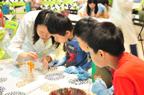 动手实验中最有趣的莫过于“水中写字”了,将羟乙基纤维素加入到水中,水就会变得粘稠,这样我们就可以用有颜色的液体在水中写出很清楚的字啦!小朋友们争先恐后地拿起滴管,用有颜色的液体水中写字,透明的玻璃培养皿中顿时换上了彩衣。最后一个动手实验便是“铁树生花”。铁单质比铜更加活泼,置换出来的铜形成漂亮的松散沉淀。小朋友们将除锈处理后的铁棒插入蓝色溶液中,没过多久,在铁棒的周围出现了一层像花一样的红色物质, “妈妈,我成功了!”“爸爸,你看铁树开花啦!”……许多小朋友纷纷跑向各自的爸爸妈妈,炫耀他们的“成果”。事实上,轮船在海水中长时间行驶,船体与海水接触部分的铁就会生锈。为了防止铁生锈, 就会利用金属活泼性的差别,在船体钉上一些更活泼的金属,这与铁树生花的原理一样。