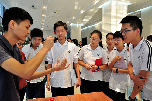 为了让同学们能更好地体验化学的神秘及奇妙之处,此次科普大讲坛的承办方——中科院上海有机所,特地在报告会之后组织安排了趣味实验现场体验活动,让学生们在亲身实践中了解化学、感知化学。展厅内,来自中科院有机氟化学重点实验室和中科院有机功能分子合成与组装化学重点实验室的志愿者们为学生们精心准备了8个趣味化学实验:尼龙拉丝、水中写字、大白洗白白、水果电池、牙膏中的氟元素、液体变软胶、热冰实验、班氏试剂检测还原性糖。在志愿者的指导下,同学们自己动手操作起实验,亲自感受化学的神奇魅力,活动现场热情飞扬。