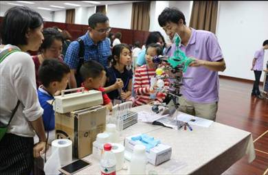 一个个简单有趣的实验,加上志愿者耐心细心的讲解,孩子们亦如进入到了化学分子你牵我绕碰碰撞撞的世界。每个实验台前久久停留不去的人群,自动以”拖堂”的形式结束了这一天的活动。