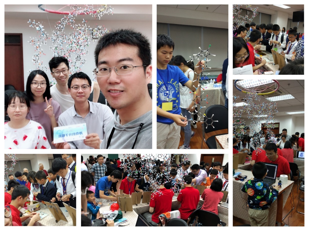 王任小课题组展示的是“神奇的分子模拟”。志愿者搭建了一个Bcl-xL蛋白分子的球棍模型,吸引了不少参观者的驻足拍照留念。同时,志愿者们设置了“爱拼才会赢”的闯关游戏,参观者可以用球棍模型拼出不同难度的小分子,如水分子、多巴胺、维生素C、青蒿素、油酸、葡萄糖等。类似乐高一样的“积木”游戏,很快地吸引了学生和家长。不少小朋友跃跃欲试,挑战拼出更难、更复杂的分子。志愿者们一边帮助小朋友拼出小分子,一边给参观者介绍其中的化学知识:原子、分子的构成;化学键的形成;分子的构象;以及这些分子的发现和重要生理功能。不少学生和家长感到十分有趣,还提出各种各样的问题,志愿者们也一一耐心解答。志愿者也使用分子模拟软件,展示了Bcl-xL和ABT-737复合物的三维结构;另外也展示了蛋白与小分子的相互作用模式的趣味科普视频。看到化学微观世界的样子,参观者们都惊叹我们的世界竟然是由这样的原子和分子所组成的。