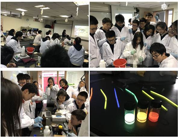 在了解荧光棒的发光原理后,韩丽丽和曾凯星带领大家进入“自制荧光棒”趣味小实验环节。韩丽丽首先先让大家了解化学实验的基本防护设施,并给同学们发放实验相关试剂及手套。随后边解说边示范,先让同学将TCPO、乙酸钾、荧光剂加入在样品瓶中,并加入少量乙酸乙酯溶解;随后滴加,适量30%双氧水,摇匀后便立即呈现红、蓝、绿及黄等多种颜色的荧光。一位同学也自告奋勇上台体验 “自制荧光棒”,当将所有试剂加入在一起混匀后,他成功调制出自己的“荧光”,台下的同学们羡慕不已。随后在韩丽丽和曾凯星的指导下同学们也纷纷制作起自己的荧光棒。不一会儿,光线暗淡的教室里充溢这各种各样的荧光,同学们也饶有兴趣的将不同的荧光溶液混合在一起,创造出更加多彩的光芒。