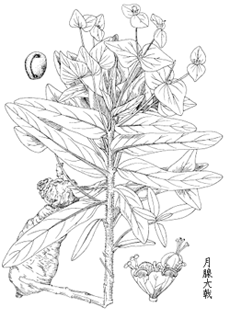 化合物成分: ①月腺大戟根中含:双〔(5-甲酰基-糠基)-醚〕;2,4-二羟基-6-甲氧基-3-甲基苯乙酮;2-羟基-6-甲氧 基-3甲基苯乙酮-4-β-葡萄糖甙;二十八烷酸;胡萝卜甙;β-谷甾醇;3,3’-二乙酰基-4,4’-二甲氧基- 2,2’;6,6’-四羟基二苯甲烷等化合物。 ②狼毒大戟根中含:O-乙酰基-N-(N-苯甲酰-L-苯丙氨基)苯基阿兰醇;羽扇豆醇;羽扇豆醇-3-乙酰化物; β-谷甾醇;岩大戟内酯A、B;17-羟基岩大戟内酯;狼毒大戟素A、B;菜油甾醇;7-氧代菜油甾醇; 7α-、7β-羟基菜油甾醇;豆甾醇(stigmasterol),7-氧代豆甾醇;7α-、7β-羟基豆甾醇;7-氧代谷甾醇; 7α-、7β-羟基谷甾醇及它们的酯类。 药理作用: ①抗肿瘤作用。 ②其他作用:狼毒大戟根可用以杀蛆,灭孑孓。 ③毒副反应 狼毒大戟B样提取物在抑瘤同时可使给药组鼠体重与对照组比较平均减轻9.7%,反映出该药物 的一定毒性。 |