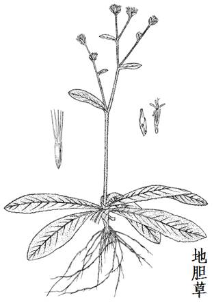 苦地胆根为菊科植物地胆草的根。 ①地胆草 为多年生草本,高30-60cm。根状茎平卧斜升;茎直立,粗壮,二歧分枝,茎枝被白色粗硬毛。单叶,大都为基生;叶片匙形、长圆状匙形工长圆状披针形,长5-18cm,宽达2-4cm,先端钝圆,基部渐狭,边缘有圆齿状锯齿,两面被白色长粗毛,下面沿脉及叶缘的毛较密;茎生叶少而小。头状花序约有小花4个;总苞片8枚;多数头状花序密集成复头状花序,被通常3枚、卵形至长圆状卵形、长1-1.5cm的叶状苞片所包围;花冠筒状,淡紫色;全为两性花,先端4裂,一边开裂。瘦果有棱,被白色柔毛,先端具长硬刺毛;冠毛1层,污白色;中上部细长,基部宽阔。药期7-11月,果期11月至次年2月。 ②白花地胆草 多年生草本,高0.8-1m,或更高。根茎粗壮,斜升或平卧,具纤维状根。茎直立,多分枝,具棱条,被白色开展的长柔毛, |