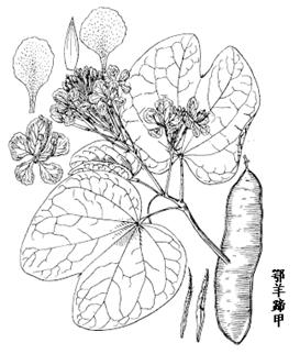 鄂羊蹄甲是木质藤本,被稀疏红棕色柔毛。茎纤细,四棱。卷须1个或2个对生。单叶互生;叶柄长3.5-4.5cm;叶片肾形或圆形,长3-8cm,宽4-9cm,先端分裂,裂片顶端圆形,全缘,基部心形至截平,两面疏生红褐色柔毛,后上面无毛;叶脉掌状,7-9条。伞房花序顶生,长5-8cm,花序轴、花梗密被红棕色柔毛;苞片和小苞片丝状,被红棕色柔毛,长7mm;萼管状,有红棕色毛,筒部长1.3-1.7cm,裂片2个;花冠粉红色,花瓣5,匙形,两面除边缘外,均被红棕色长柔毛,边缘皱波状,基部楔形,长1-1.5cm;能育雄蕊仅3枚,花丝长约1.5-2cm,花药瓣裂;雌蕊单一,子房长柱形,具长柄,无毛;柱头头状。荚果条形,扁平,无毛,有明显的网脉,长14-30cm,宽4-5cm,种子多数。花期4-6月,果期8-9月。 |