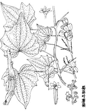 蜀葵叶薯蓣是缠绕草质藤本。根茎横生,细长条形,分枝纤细。茎幼嫩时具稀疏的长硬毛,开花结实后近于无毛。单叶互生,叶柄通常比叶片长;叶片宽卵状心形,长10-13cm,宽10-13cm,先端渐尖,边缘浅波状或4-5浅裂,表面有时有毛,背面脉上密被白色短柔毛。花小,单性,雌雄异株。雄花有梗,长2-3mm,常由2-5朵集成小聚伞花序再组成总状花序,有时花序轴分枝形成圆锥花序;花被碟形,基部连合成管,先端6裂,开花时裂片平展,雄蕊6枚,花丝较短,有时弯曲。雌花序穗状,有花40朵或更多,单生或2-3个簇生叶腋;苞片披针形;退化雄蕊丝状或无。蒴果三棱形,长约2.5cm,宽约1.5cm,基部渐狭,先端稍宽大,表面草黄色,有光泽;种子着生于每室中轴基部,向先端有斧头状的宽翅,长约8mm。花期6-8月,果期7-9月。 |