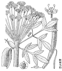 阿坝当归多年生草本,高1~2m。根圆柱形,长达20cm,径1~4cm,棕褐色,顶端残留紫色膜质叶鞘纤维。茎粗壮,中空,带紫色,被白色短柔毛。茎下部叶的叶柄基部膨大成广卵形、阔兜状的抱茎叶鞘,长6~8cm,宽至10cm;叶片轮廓为长椭圆形或三角状卵形,二至三回羽状分裂,具3~4对羽状裂片,末回裂片长椭圆形至披针形,长45cm,宽15~25cm,先端渐尖,边缘有钝锯齿;茎上部叶简化,仅具有3裂小叶片的宽阔叶鞘。复伞形花序顶生或侧生,直径达20cm;花序梗长16~20cm,被粗柔毛;总苞片5~9,披针形;伞辐30~65,带紫色,被短柔毛;小总苞片4~8,线形,小伞形花序有花25~50;萼齿不明显;花瓣5,白色;花柱基短圆锥形。果实椭圆形至广圆形,黄棕色,质厚,侧棱具宽翅,与果体等宽或超过,每棱槽中有油管1。花期7~9月,果期8~10月。 |
