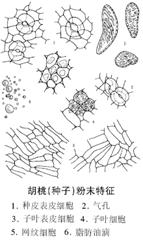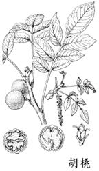 胡桃仁为胡桃科植物胡桃的种仁? 胡桃JuglansregiaL[J. orientisDode;J. sinensis(C. DC. )Dode]又名:羌桃《名物志》,播罗斯《梵书》,核桃《纲目》,播师罗《广群芳谱》? 该植物为落叶乔木,高20~25m?树皮灰白色,幼时平滑,老时浅纵裂?小枝被短腺毛,具明显的叶痕和皮孔;冬芽被芽鳞;髓部白色,薄片状?奇数羽状复叶,互生,长40~50cm,小叶5~9枚,有时13枚,先端1片常较大,椭圆状卵形至长椭圆形,长6~15cm,宽3~6cm,先端钝圆或锐尖,基部偏斜,近于圆形,全缘,表面深绿色,有光泽,背面淡绿色,有侧脉11~19对,脉腋内有一簇短柔毛?花单性,雌雄同株,与叶同时开放,雄?荑花序腋生,下垂,长5~10cm,花小而密集,雄花有苞片1,长圆形,小苞片2,长卵形,花被片1~4,均被腺毛,雄蕊6~30;雌花序穗状,直立,生于幼枝顶端,通常有雌花1~3朵,总苞片3枚,长卵形,贴生于子房,花后随子房增大;花被4裂,裂片线形,高出总苞片;子房下位,2枚心皮组成,花柱短,柱头2裂,呈羽毛状,鲜红色?果实近球形,核果状,直径4~6cm,外果皮绿色,由总苞片及花被发育而成,表面有斑点,中果皮肉质,不规则开裂,内果皮骨质,表面凹凸不平,有2条纵棱,先端具短尖头,内果皮壁内具空隙而有皱折,隔膜较薄,内里无空隙?花期5~6月,果期9~10月?生于山地及丘陵地带?我国南北各地均有栽培?