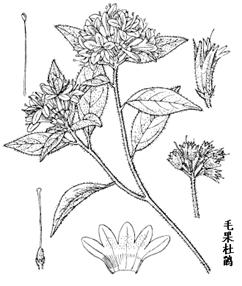 毛果杜鹃属半常绿灌木,高达2m。多分枝,幼枝密被扁平灰色或红色糙伏毛,老枝渐光滑无毛,树皮纵裂多纤维。叶二型,革质,簇生枝顶;叶柄长3-5mm,密被糙伏毛;春叶卵形至长圆状披针形,长4-6.5cm,宽0.8-2.5cm,先端渐尖,有短尖头,基部宽楔形,上面无毛或近无毛,下面密生红棕色长糙伏毛;夏叶较小,卵形,长1.5-2.5cm,宽6-8mm。伞形花序顶生,有花3-10朵,花梗长3-5mm,密生糙伏毛;花萼小,裂片不明显,近圆形,密生红棕色扁平毛;花冠狭漏斗状,白色或淡红色,花冠筒长约8mm,带蔷薇色,外面被疏毛,裂片较长,开展,上方有紫红色斑点;雄蕊5,伸出花冠外,花药背着,顶孔开裂;子房1,花柱基部有柔毛。蒴果椭圆形,长8-10mm,密生糙伏毛。花期4月,果期9月。 |
