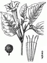 毛曼陀罗是一年生草本,高1-2m。有恶臭,全株被白色细腺毛及短柔毛。茎粗壮,直立,圆柱形,基部木质化,上部多呈叉状分枝,灰绿色。叶互生或近对生;叶片广卵形,长8-20cm,宽5-12cm,先端急尖,基部斜心形,全缘或呈微波状,背面叶脉隆起。花大,直立或斜升,长15-20cm,直径7-8cm,花冠白色或淡紫色,具5棱;花萼筒部有5棱角,先端5浅裂,花后自近基部断裂,宿存部分椭果实而增大并向外反折。蒴果生于下垂的果梗上,近圆形,密生柔韧针状刺并密被短柔毛,熟时先端不规则裂开。种子多数,肾形,淡褐色或黄褐色。花期5-9月,果期6-10月。 |