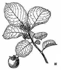 柿是落叶大乔木,高达14m。树皮深灰色至灰黑色,长方块状开裂;枝开展,有深棕色皮孔,嫩枝有柔毛。单叶互生;叶柄长8-20mm;叶片卵状椭圆形至倒卵形或近圆形,长5-18cm,宽2.8-9cm,先端渐尖或钝,基部阔楔形,全缘,上面深绿色,主脉生柔毛,下面淡绿色,有短柔毛,沿脉密被褐色绒毛。花杂性,雄花成聚伞花序,雌花单生叶腋;总花梗长约5mm,有微小苞片;花萼下部短筒状,4裂,内面有毛;花冠黄白色,钟形,4裂;雄蕊在雄花中16枚,在两性花中8-16枚,雌花有8枚退化雄蕊;子房上位,8室,花柱自基部分离。浆果形状种种,多为卵圆球形,直径3.5-8cm,橙黄色或鲜黄色,基部有宿存萼片。种子褐色,椭圆形。花期5月,果期9-10月。 |