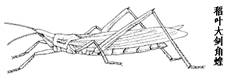 2.中华稻蝗的体长圆形,长3-4cm,黄绿色或绿色,有时黄褐色,有光泽。头顶有圆形凹窝,颜面中部沟深。复眼灰色,椭圆形,触角丝状,褐色。前胸发达,中部有横缝3条。前翅前缘部分呈绿色,余部褐色,腹部黄褐色,雄体腹末端屈曲向上。 3.稻叶大剑角蝗的体细长圆形,雄虫长约5.4cm,雌虫长约9cm,全体绿色,有时呈灰褐色。头圆锥形,颜面尖形,显著倾斜,咀嚼式口器,触角剑形。雌虫前翅的中央具有1列纵行的白色纹。 |